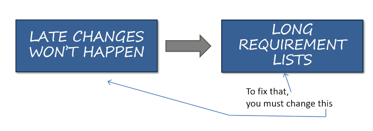 IT keeps pushing the business to better prioritize their needs–with little effect. That’s because it’s not hitting the root cause: the business has learned over time that anything not on the initial requirements list is eternally “out of scope” due to budget constraints, outsourcing contracts, or timeline commitments. That means late changes can only be delivered with a pricey change order, or more likely, never. Once the root cause is clear, the answer becomes apparent: