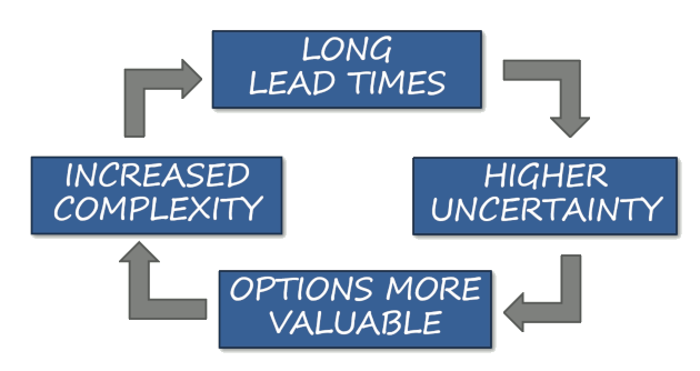 Now that effect is also a cause, you may wonder where to start breaking this cycle. In this example, the natural starting point are the lead times: you’ll have to break large deliverables down into smaller, incremental ones, which carry less uncertainty.